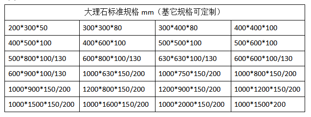 大理石平臺(tái)在工廠檢驗(yàn)、測(cè)量,實(shí)驗(yàn)室實(shí)驗(yàn)等方面都適用,大理石平臺(tái)一般規(guī)格從200*200到2000*4000mm不等,我們有自己的標(biāo)準(zhǔn)規(guī)格(見圖1)。有時(shí)候客戶需要的尺寸并不是標(biāo)準(zhǔn)規(guī)格,就需要定制,這時(shí)候會(huì)有客戶考慮說(shuō)定制大理石平臺(tái)是不是比標(biāo)準(zhǔn)的價(jià)格高,其實(shí)并不是這樣的。大理石平臺(tái)的加工是先采用鋸床切割出適合的尺寸,然后經(jīng)過(guò)人工研磨制成的。不管是標(biāo)準(zhǔn)規(guī)格還是定制規(guī)格,它們的加工工序都是一樣的,像不需要打孔開溝槽的大理石平臺(tái),石料我們是按方算的,而人工研磨的費(fèi)用是按平方算,所以定制的大理石平臺(tái)價(jià)格并不高。如果是定制打孔的大理石平臺(tái),那價(jià)格就會(huì)用變化了,這時(shí)候就需要按孔的大小,孔位精度的要求,還要孔的數(shù)量來(lái)核算價(jià)格。還有一點(diǎn)就是材質(zhì)的選擇,如果要定制濟(jì)南青材質(zhì)的大理石平臺(tái),那價(jià)格就要按濟(jì)南青石料來(lái)算價(jià)格。